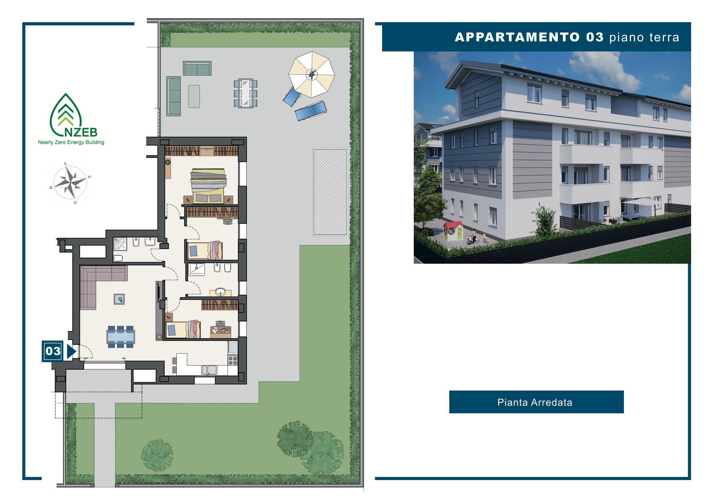 Descrizione: In elegante palazzina di NUOVA COSTRUZIONE (solo 13 unità abitative), realizzata tecnologie per il risparmio energetico, proponiamo AMPIO APPARTAMENTO al PIANO TERRA CON INGRESSO INDIPENDENTE E GIARIDNO SU 3 LATI composto da:
