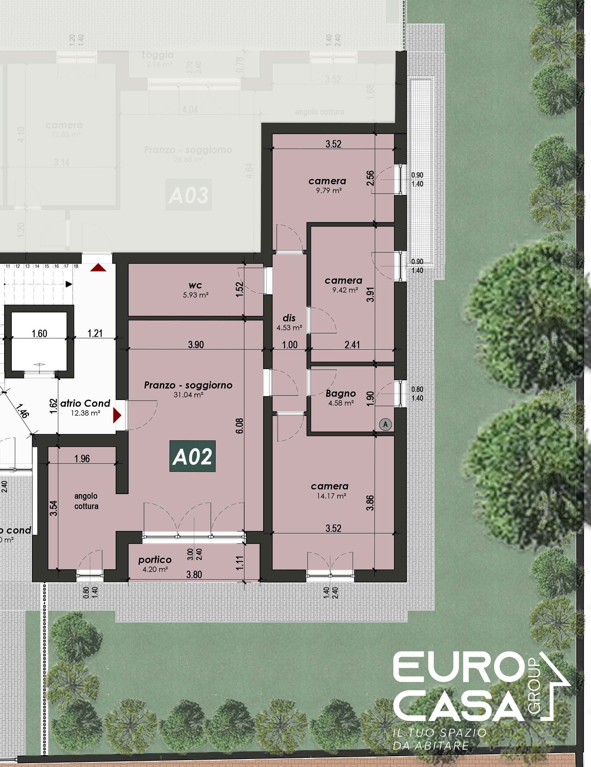 A-01 – ingresso su ampio salone con cucina separata di 31mq, ampia vetrata su GIARDINO di proprietà di oltre 190mq, 3 CAMERE da letto, 2 BAGNI. Appartamento in classe energetica A4, ottime finiture!