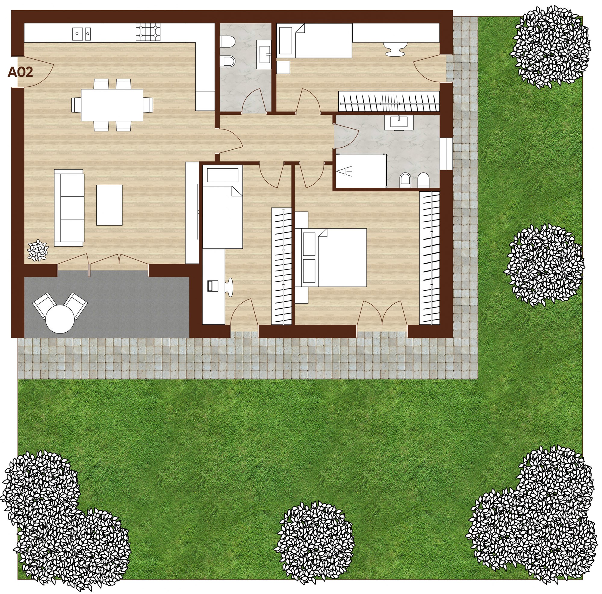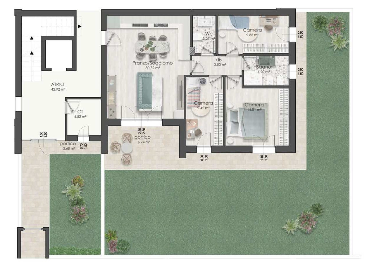 APP.TO 02 – al PIANO TERRA, ZONA GIORNO di 30mq, TERRAZZO di 7mq, GIARDINO privato di 130mq, 3 CAMERE da letto e 2 BAGNI.