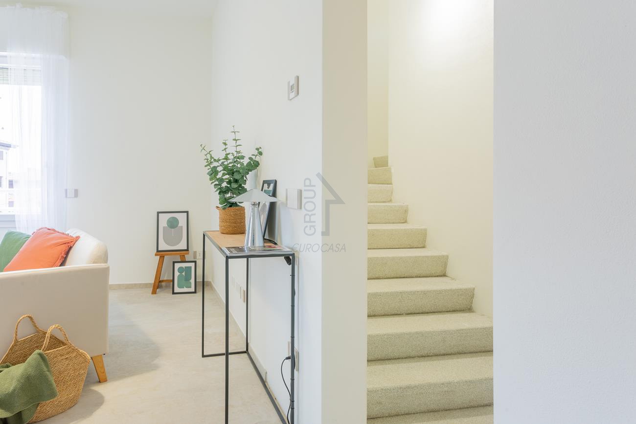 Descrizione: ELEGANTE E UNICO APPARTAMENTO DISPOSTO SU DUE LIVELLI con ingresso, AMPIO soggiorno (con predisposizione cucina), cucina abitabile (trasformabile in camera da letto) e bagno. Collegato da comoda scala interna secondo livello, composto da tre camere mansardate e bagno. Completa l’appartamento un magazzino al piano terra con basculante motorizzato utilizzabile come garage. (NO BALCONE) PRONTA CONSEGNA – – –