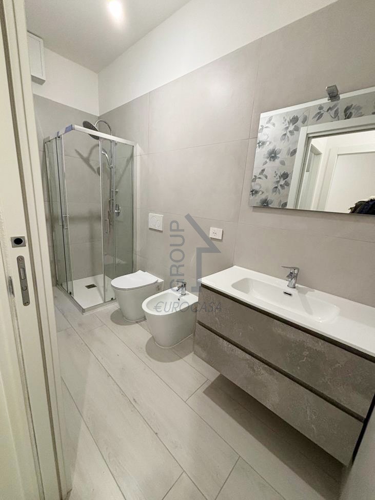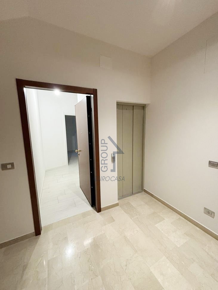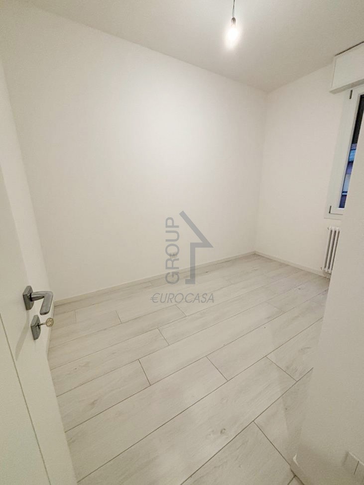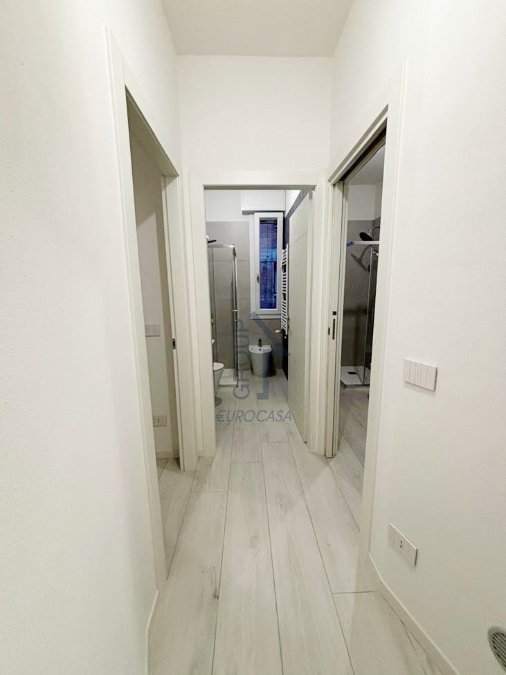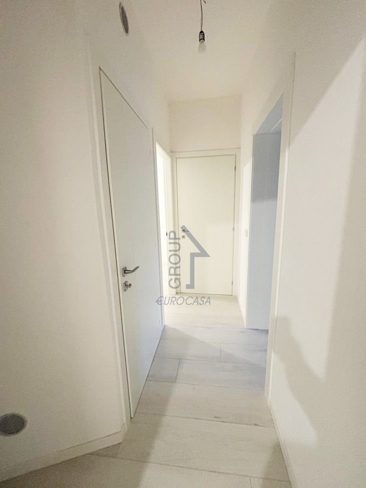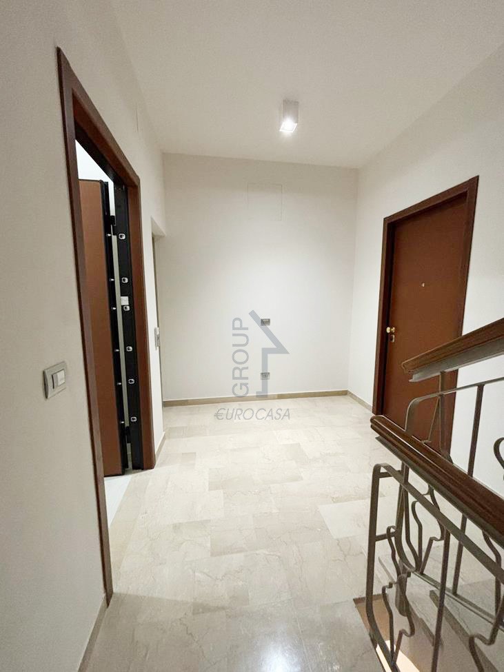 Ingresso, ampio soggiorno con angolo cottura e balcone, una camera matrimoniale con balcone, due camere singole (di cui una con ampio terrazzo di 34 mq affacciato sulla parte interna), due bagni, ripostiglio e lavanderia.