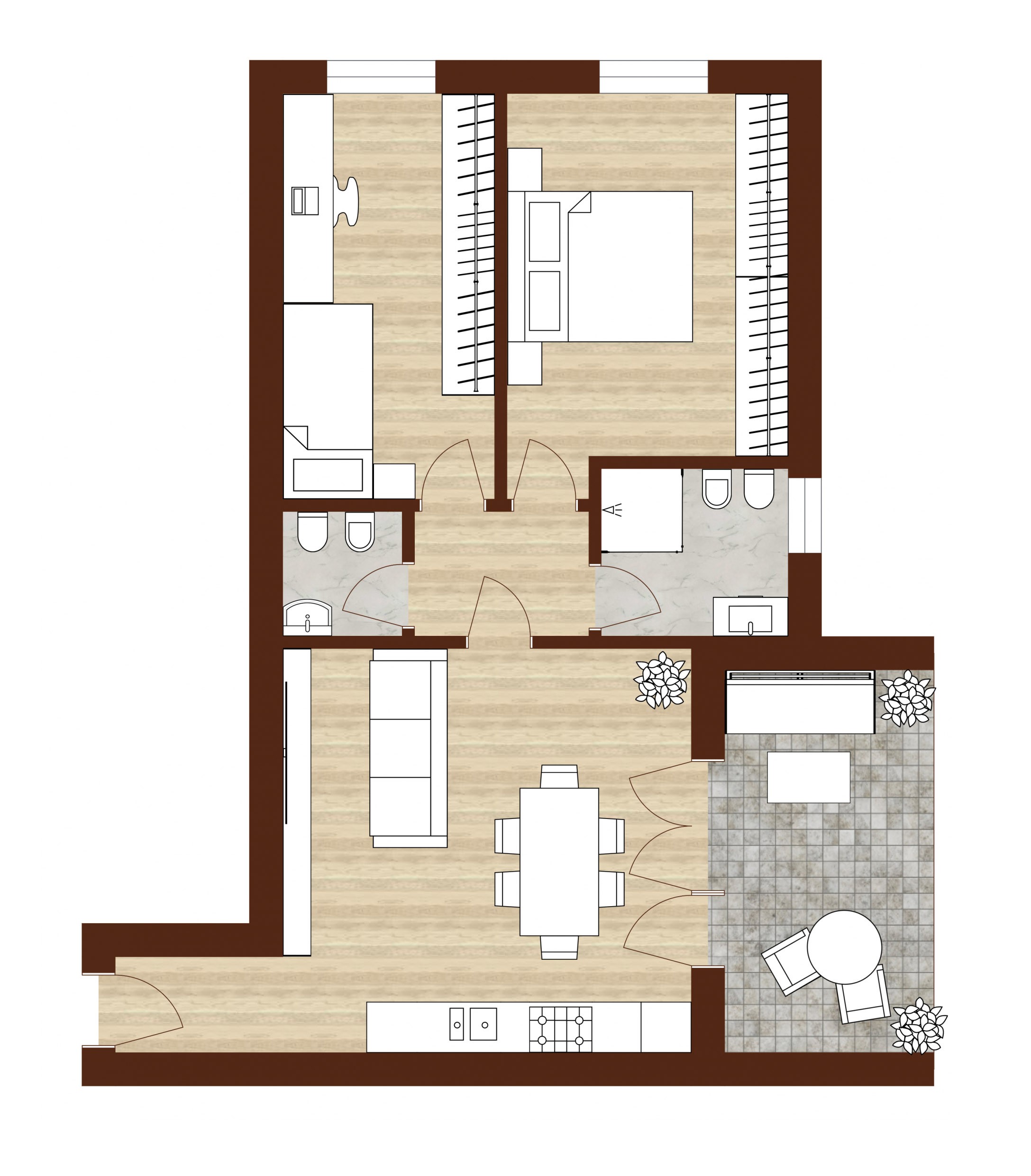 APP.TO 06 – al 1° PIANO, ZONA GIORNO di 26mq con TERRAZZO di 11mq, disimpegno notte, 2 CAMERE da letto (MATRIMONIALE + 3/4) e 2 BAGNI.