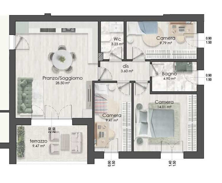 APP.TO 07 – al 1° PIANO, ZONA GIORNO di 29mq, TERRAZZO di 10mq, 3 CAMERE da letto e 2 BAGNI.
