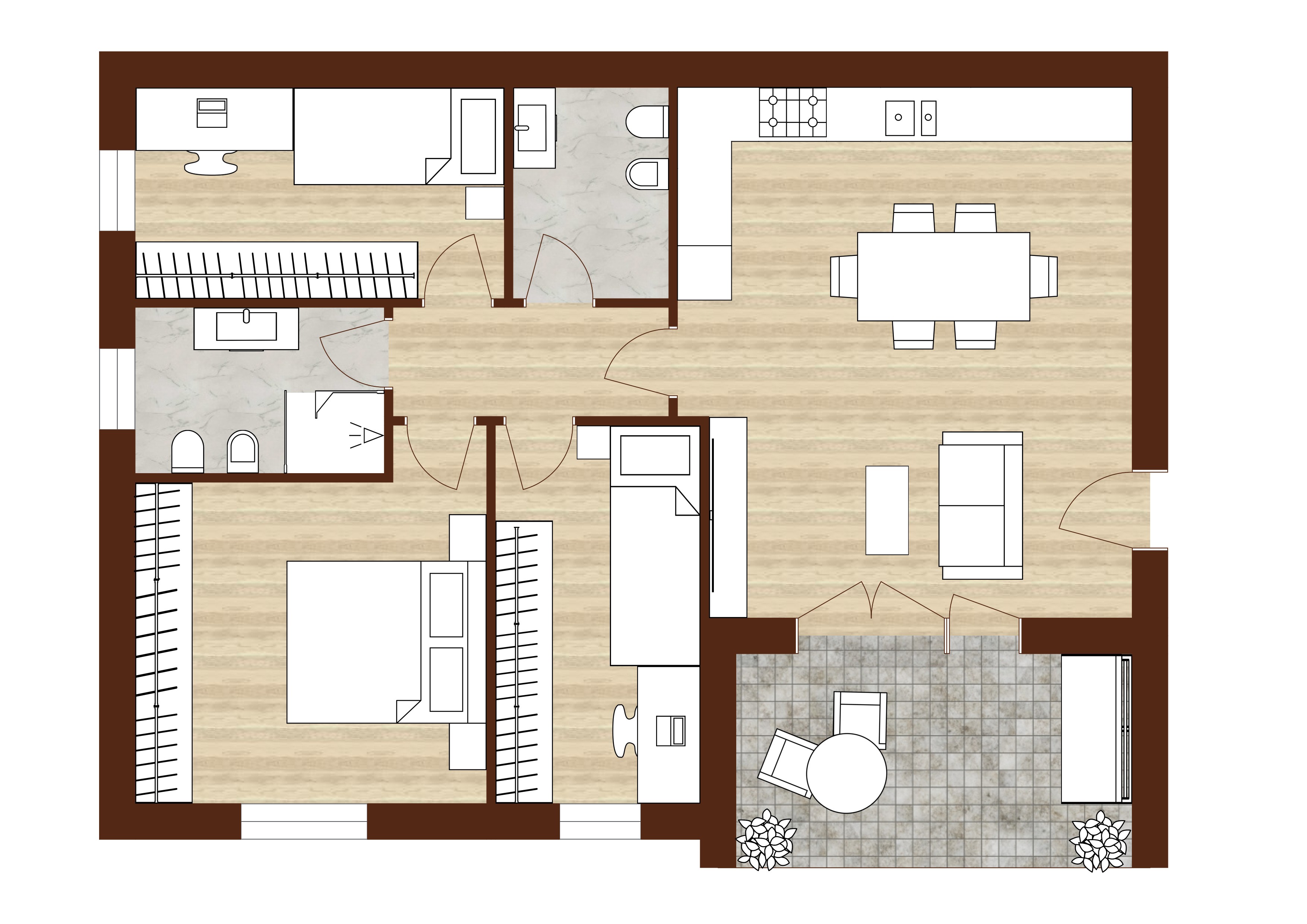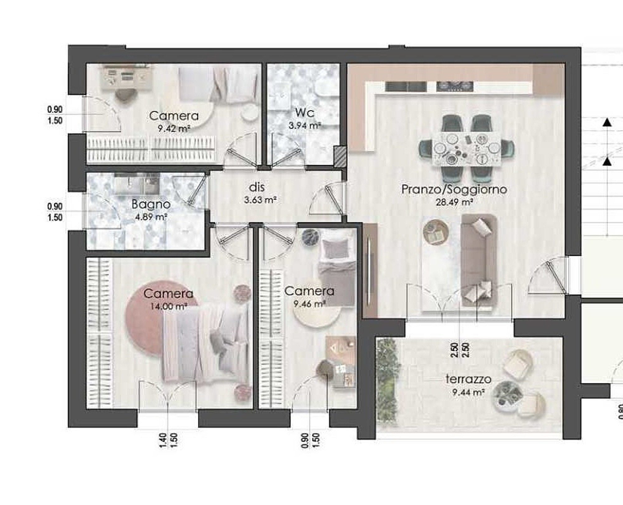 APP.TO 07 – al 1° PIANO, ZONA GIORNO di 29mq, TERRAZZO di 16mq, 3 CAMERE da letto e 2 BAGNI.