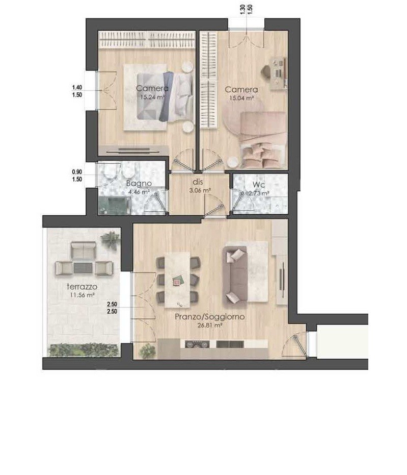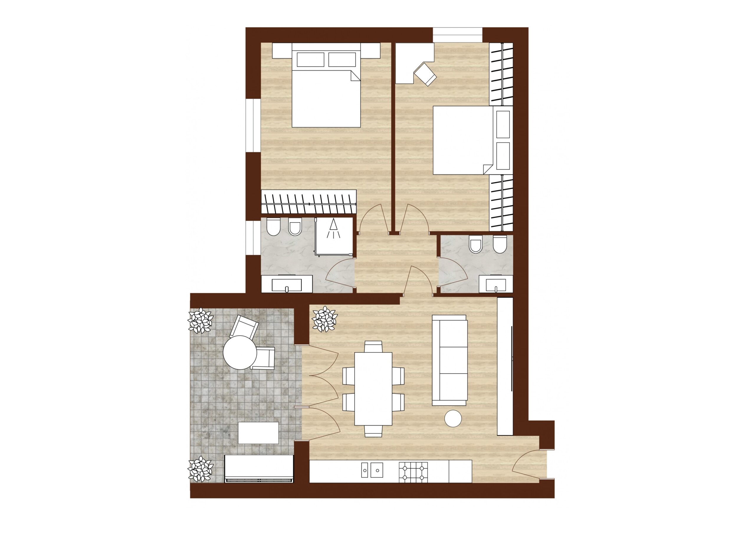 APP.TO 09 – al 2° PIANO, ZONA GIORNO di 27mq, TERRAZZO di 12mq, 2 CAMERE MATRIMONIALI e 2 BAGNI.