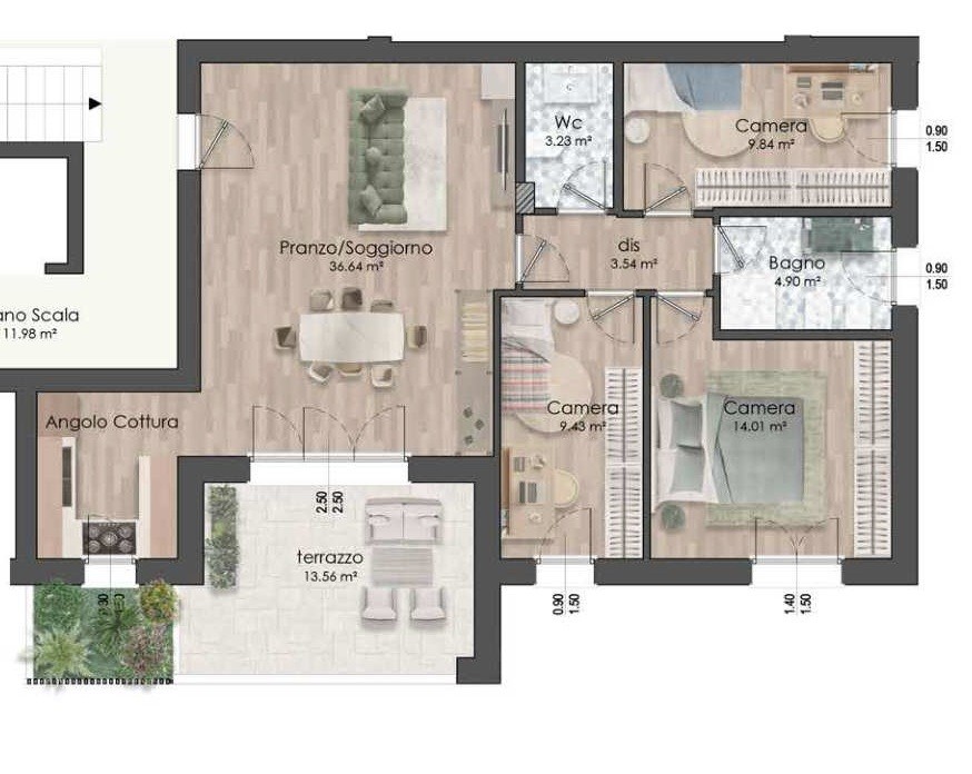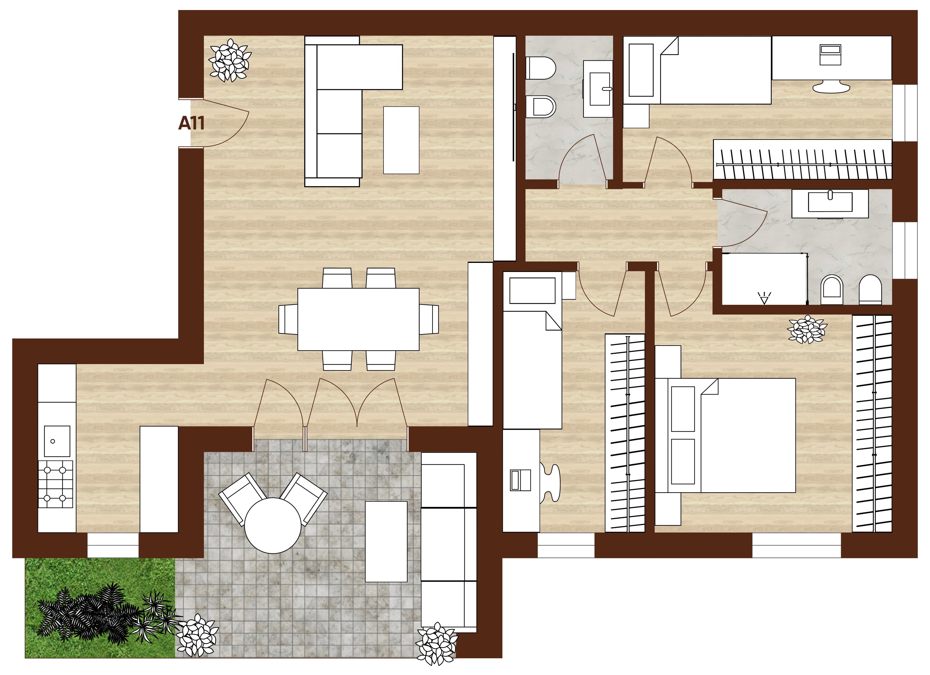 APP.TO 11 – al 2° ed ULTIMO PIANO, ampia ZONA GIORNO di 37mq, TERRAZZO di 16mq e GIARDINO Pensile di 4mq entrambi lato SUD, disimpegno notte, 3 CAMERE da letto e 2 BAGNI.