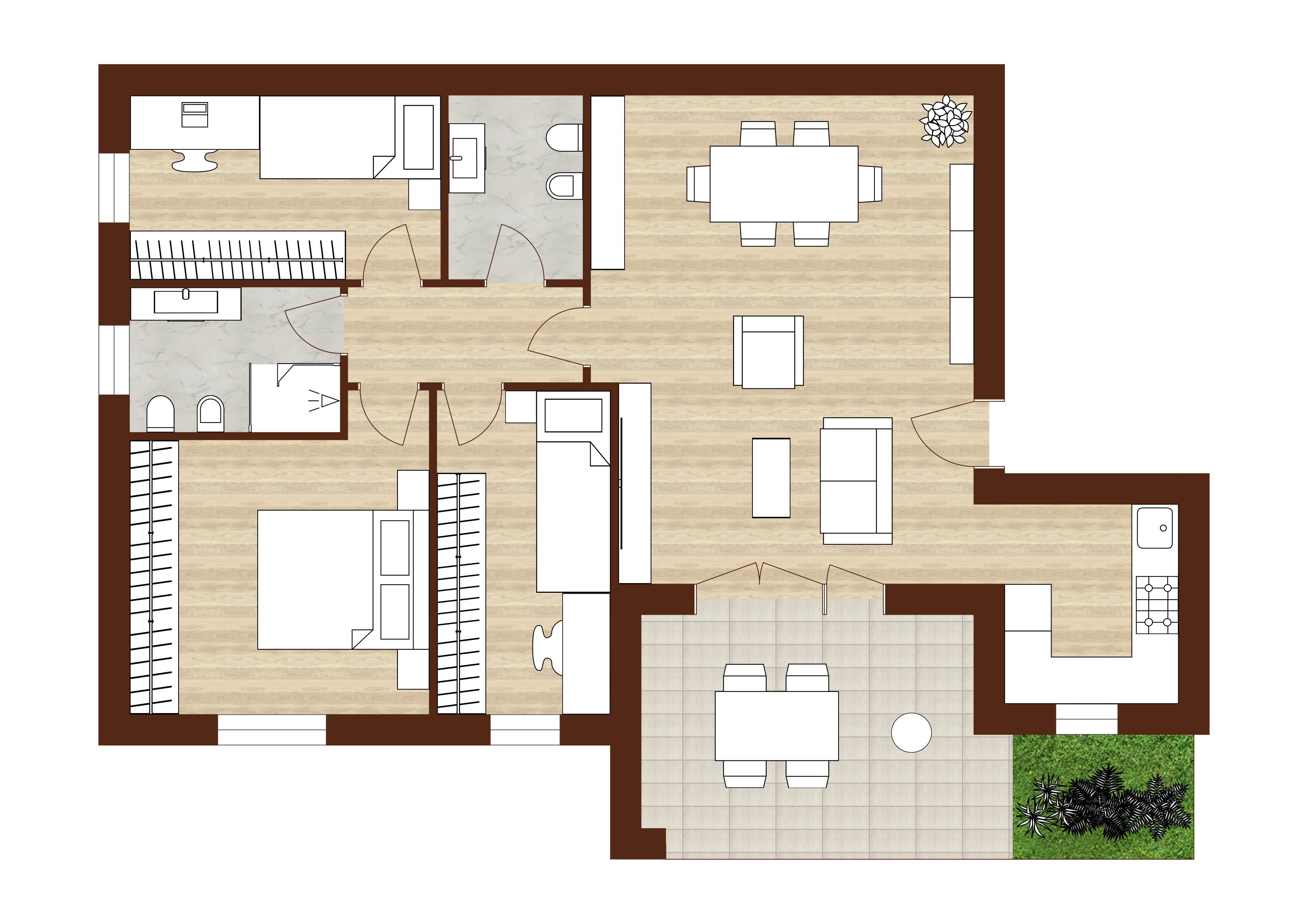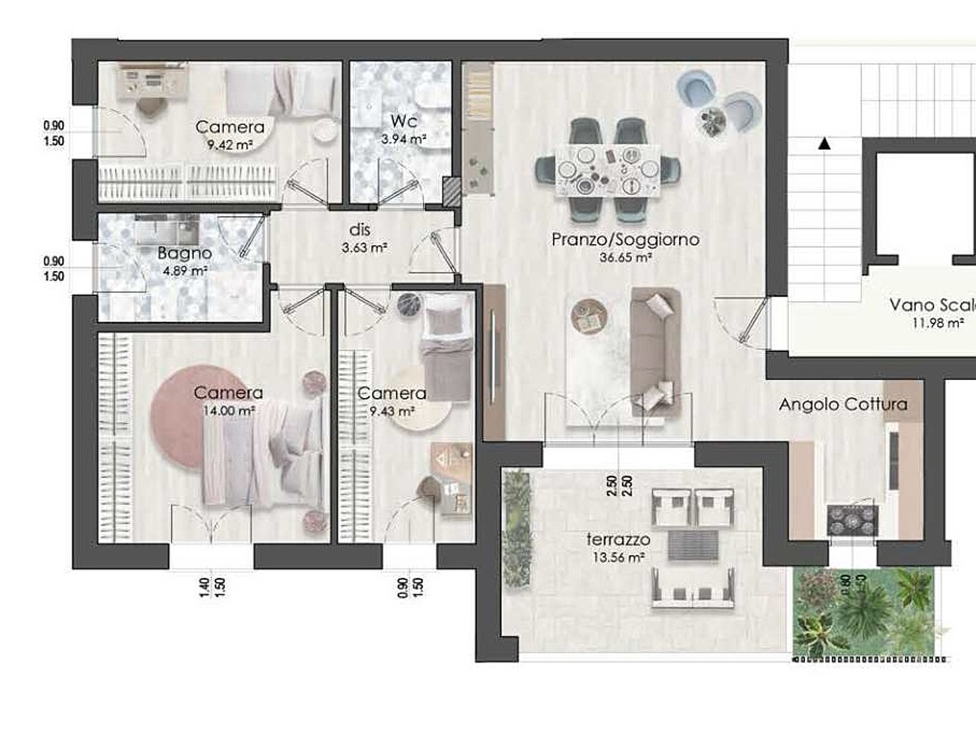 APP.TO 12 – al 2° ed ULTIMO PIANO ampia e luminosa ZONA GIORNO di 37mq con TERRAZZO da 16mq e GIARDINO Pensile di 4mq, disimpegno, 3 CAMERE da letto e 2 BAGNI.
