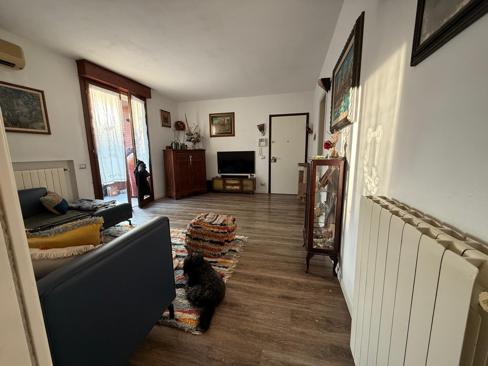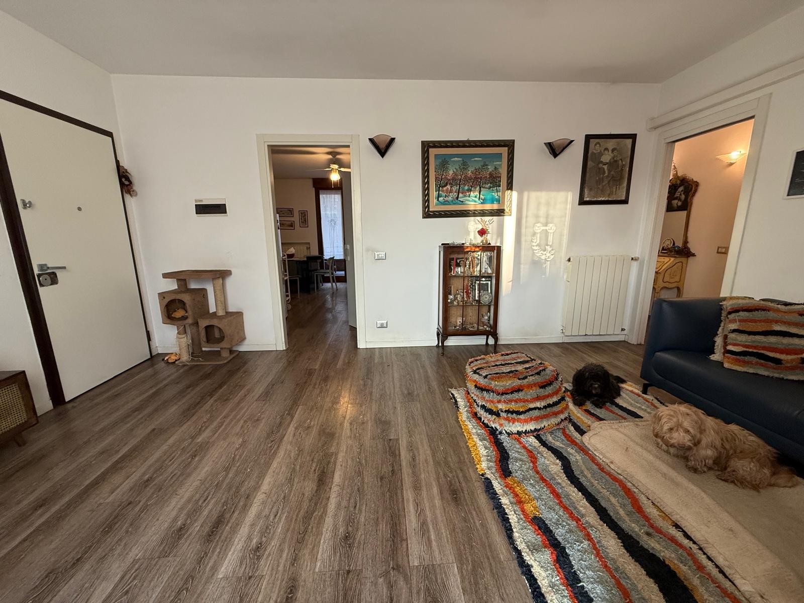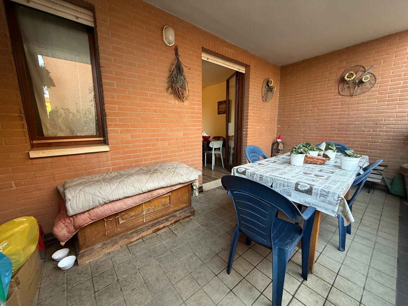 Descrizione: Appartamento al piano terra composto da ingresso in ampio soggiorno con balcone grande, cucina abitabile con giardino pavimentato e dispensa, disimpegno notte, 3 CAMERE, 2 BAGNI e garage.