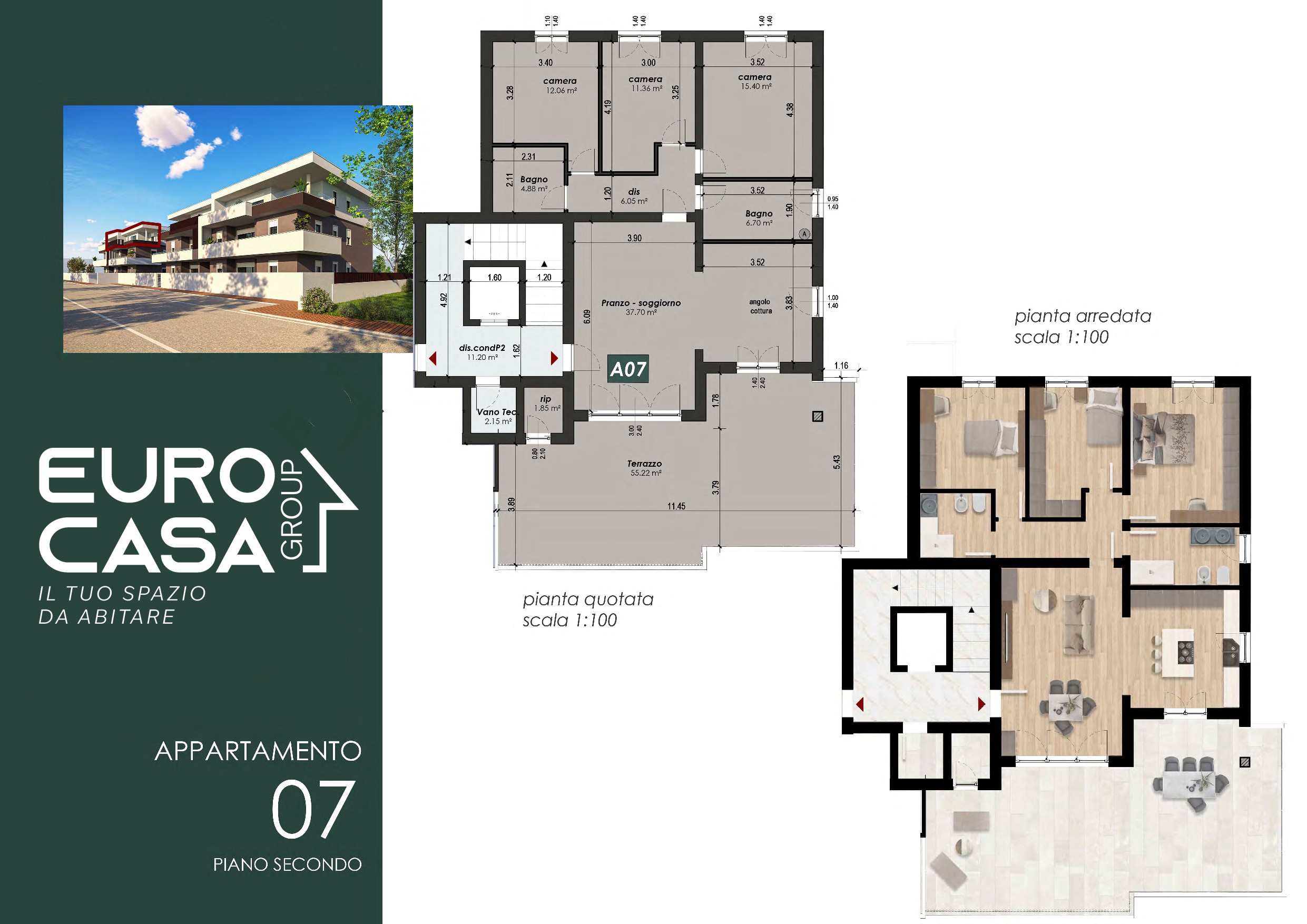 A-07 – ingresso su ampio salone con cucina separata di oltre 37mq, ampia vetrata su TERRAZZO di proprietà di oltre 50mq, 3 CAMERE da letto, 2 BAGNI. Appartamento in classe energetica A4, ottime finiture!